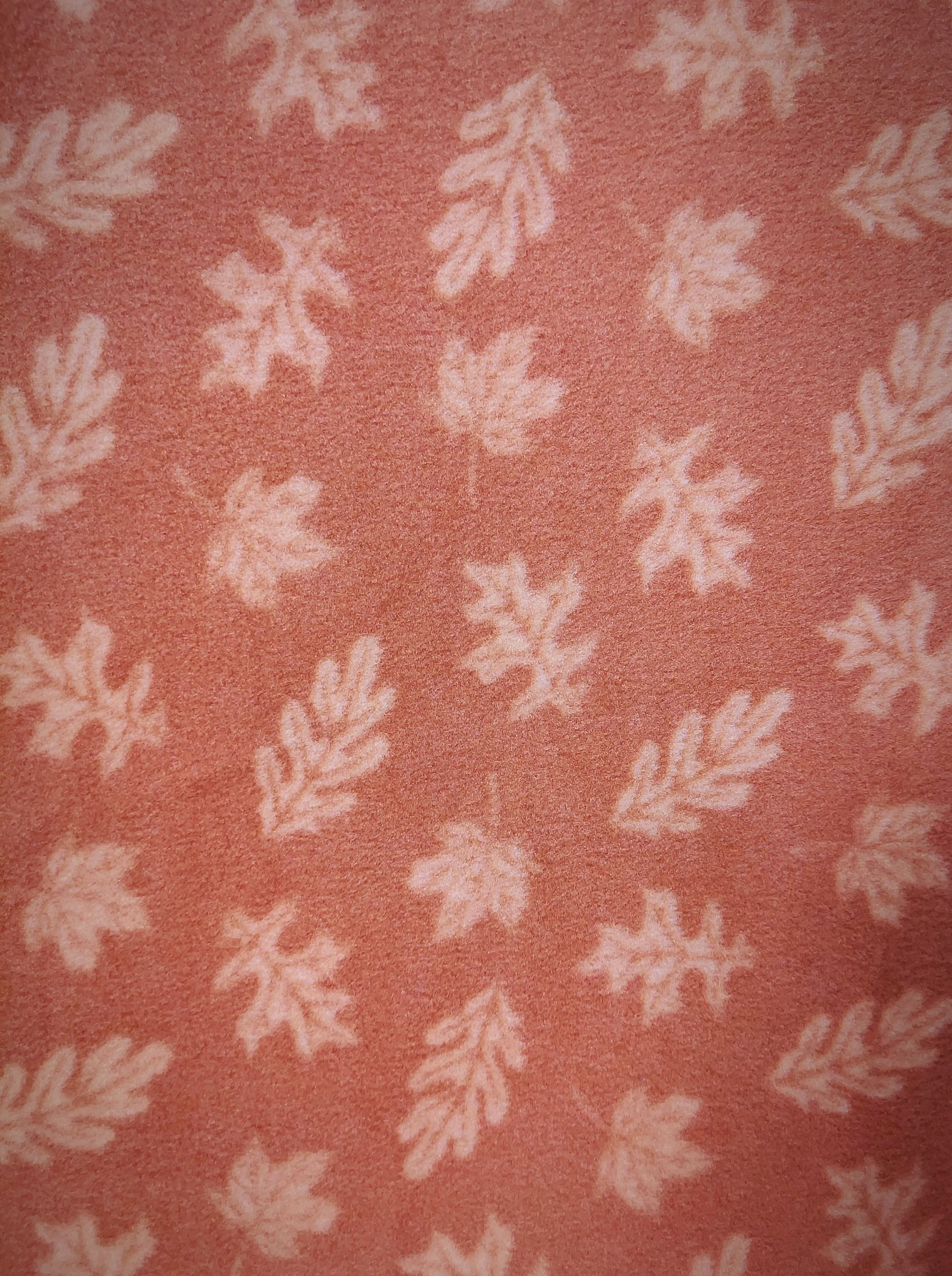 This is a soft medium weight stretchy luxe fleece with leaves on orange brown background. Print is large and designs will be random.