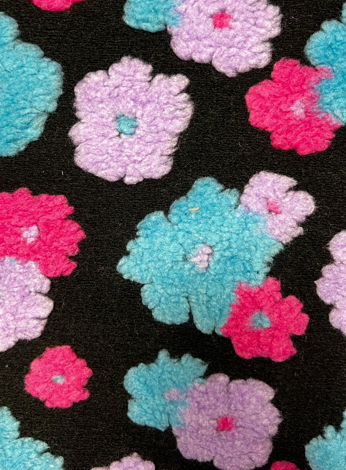 This is a heavy weight stretchy lilac, coral and aqua floral Sherpa fleece with black background. Regular Size limited to only 7. Bambino Size limited to only 7, Ankle Biter Size limited to only 2. Lil Nipper Size limited to only 2. No more will be made when they are gone.