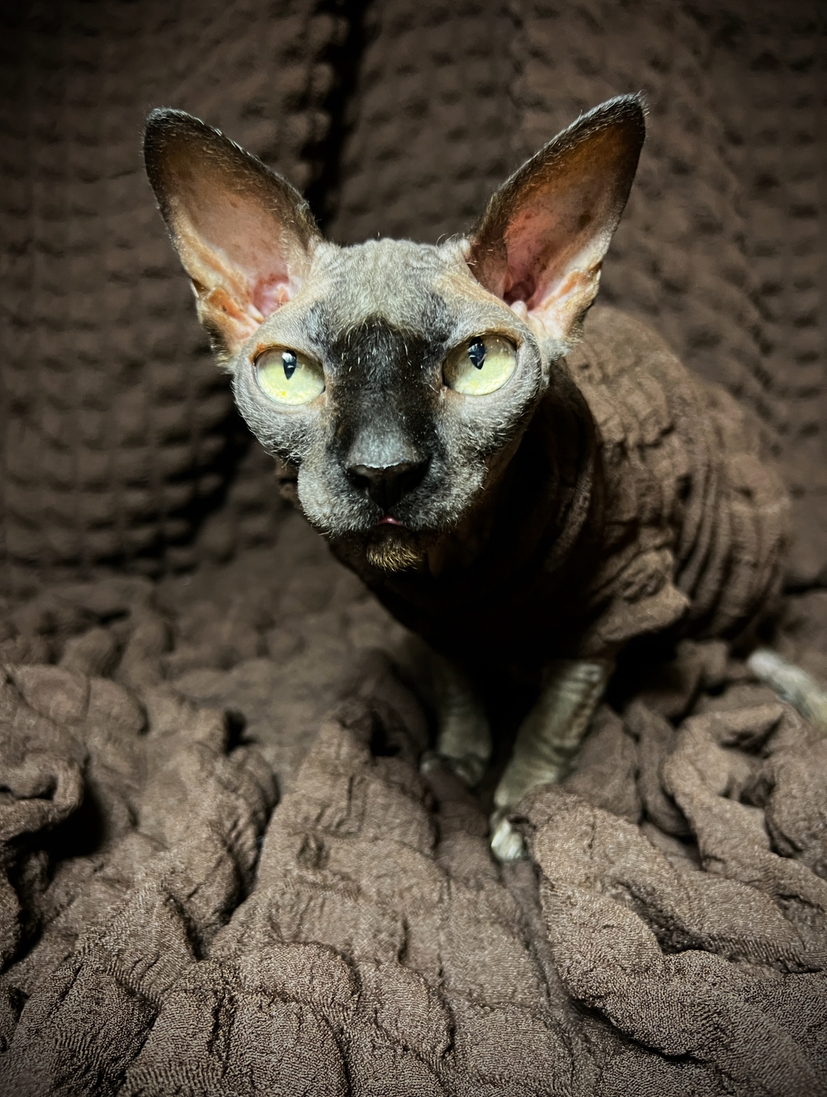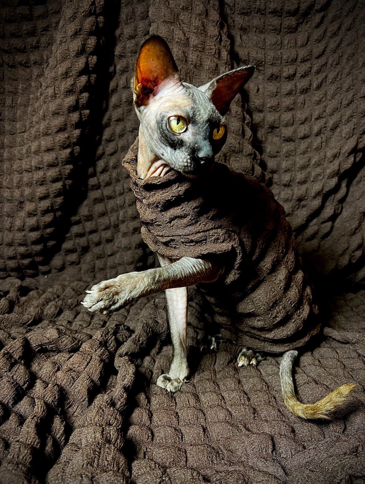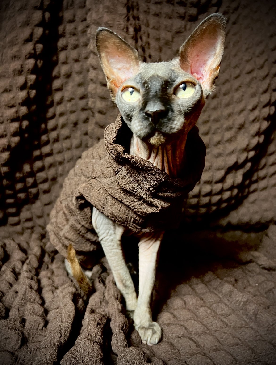 REGULAR size is for most adult hairless cats age 1 to 18. BAMBINO size fits hairless kittens age 6 months to 1 year and smaller adult cats. ANKLE BITER size fits hairless kittens 15 week to 6 month olds. LIL NIPPER size fits hairless kittens age 8 weeks to 15 week olds for when they are with the breeder or for the trip home. Custom orders are welcome for larger and smaller cats - pricing is the same - $27.50