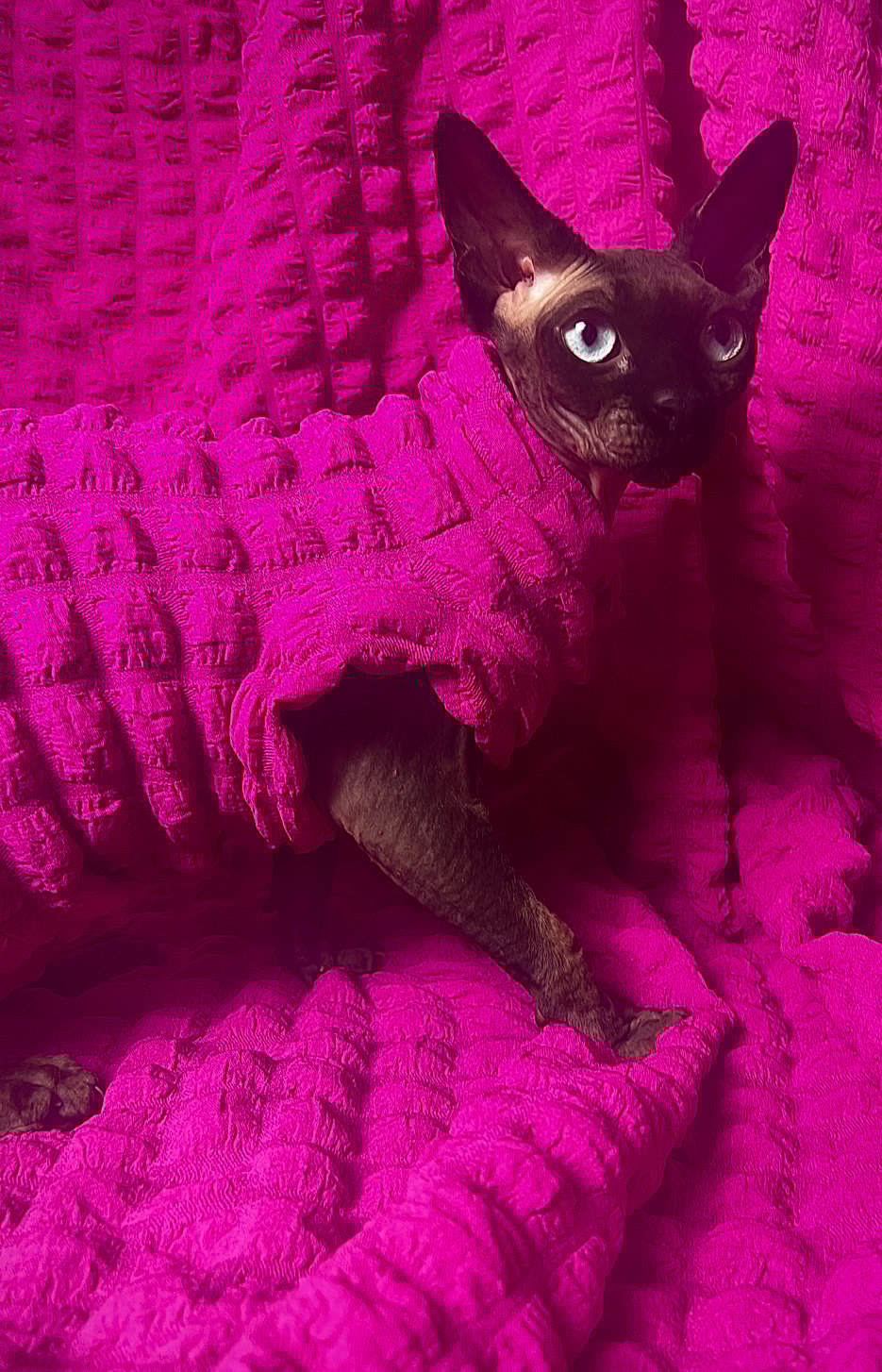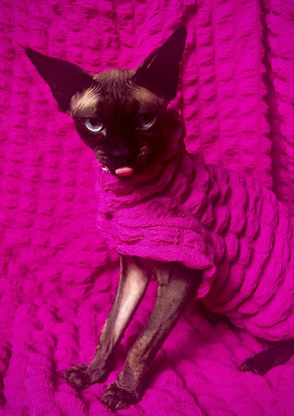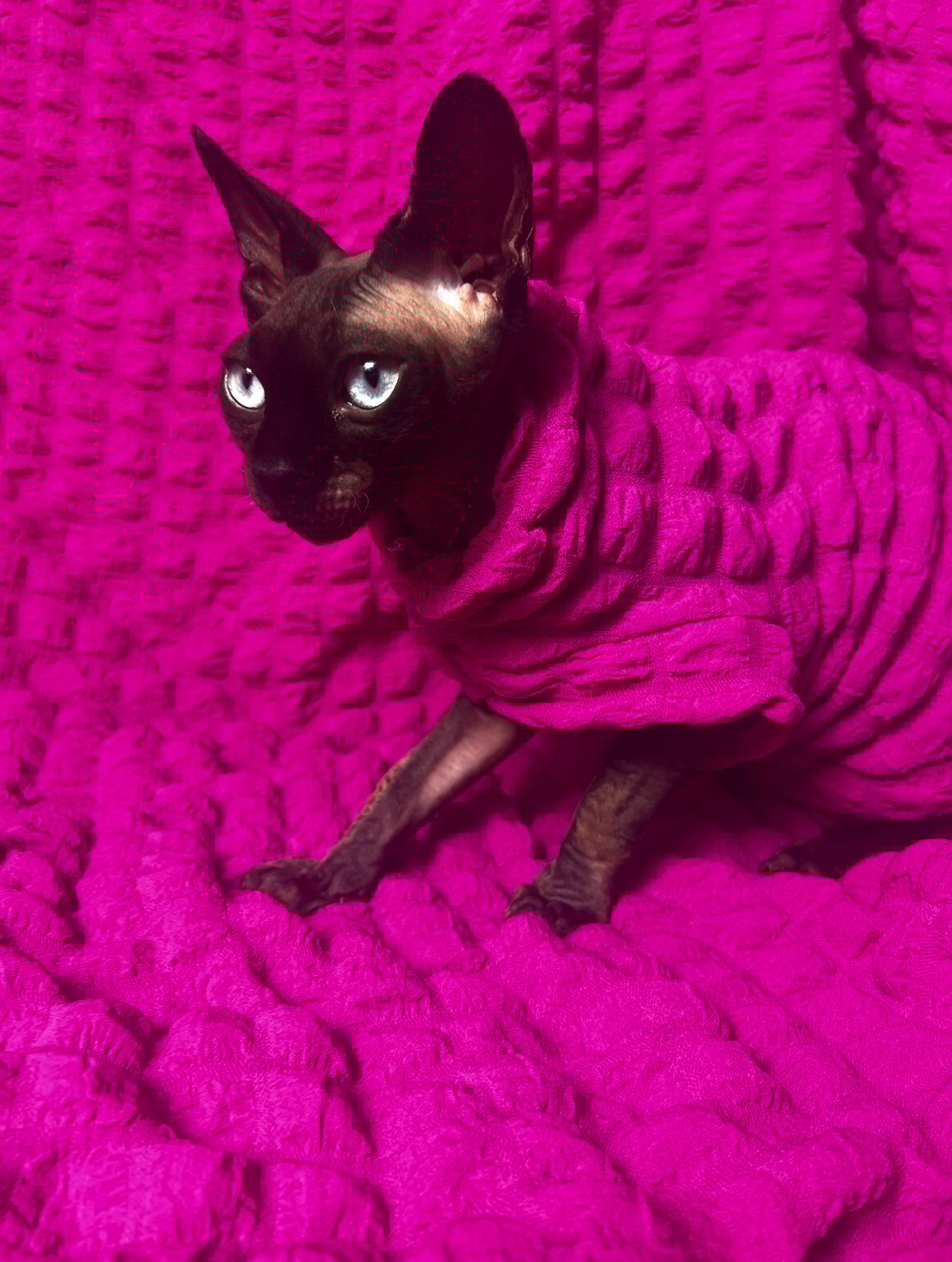REGULAR size is for most adult hairless cats age 1 to 18. BAMBINO size fits hairless kittens age 6 months to 1 year and smaller adult cats. ANKLE BITER size fits hairless kittens 15 week to 6 month olds. LIL NIPPER size fits hairless kittens age 8 weeks to 15 week olds for when they are with the breeder or for the trip home. Custom orders are welcome for larger and smaller cats - pricing is the same - $27.50