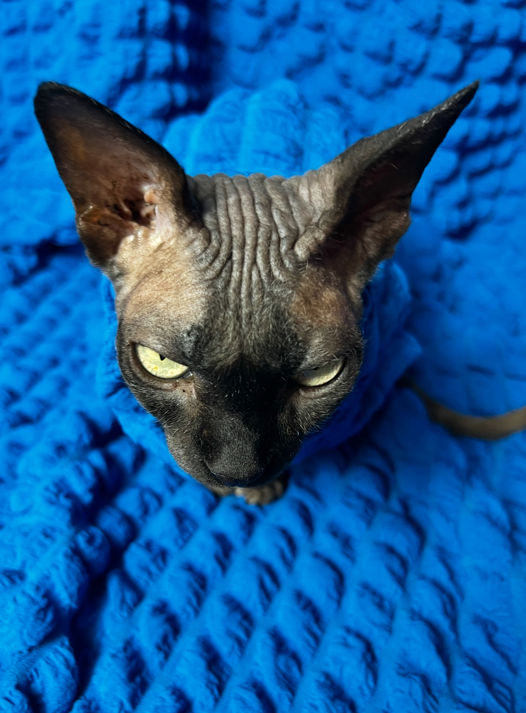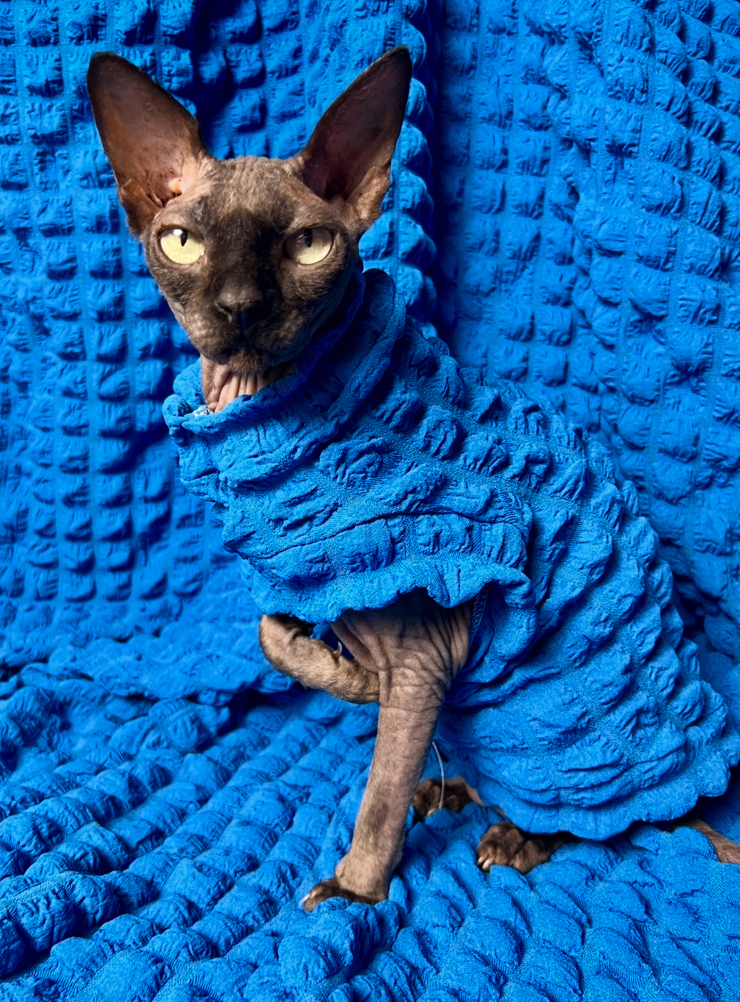REGULAR size is for most adult hairless cats age 1 to 18. BAMBINO size fits hairless kittens age 6 months to 1 year and smaller adult cats. ANKLE BITER size fits hairless kittens 15 week to 6 month olds. LIL NIPPER size fits hairless kittens age 8 weeks to 15 week olds for when they are with the breeder or for the trip home. Custom orders are welcome for larger and smaller cats - pricing is the same - $27.50