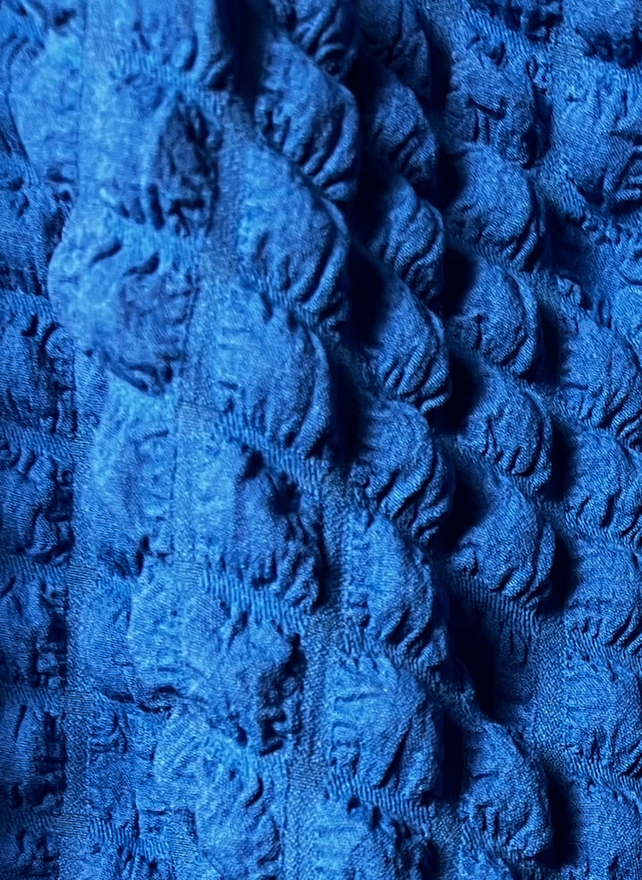 This is a stretchy lightweight blue puckered fabric. Regular Size limited to only 7. Bambino Size limited to only 8. Ankle Biter Size limited to only 2. Lil Nipper size limited to only 2. No more will be made when they are gone.