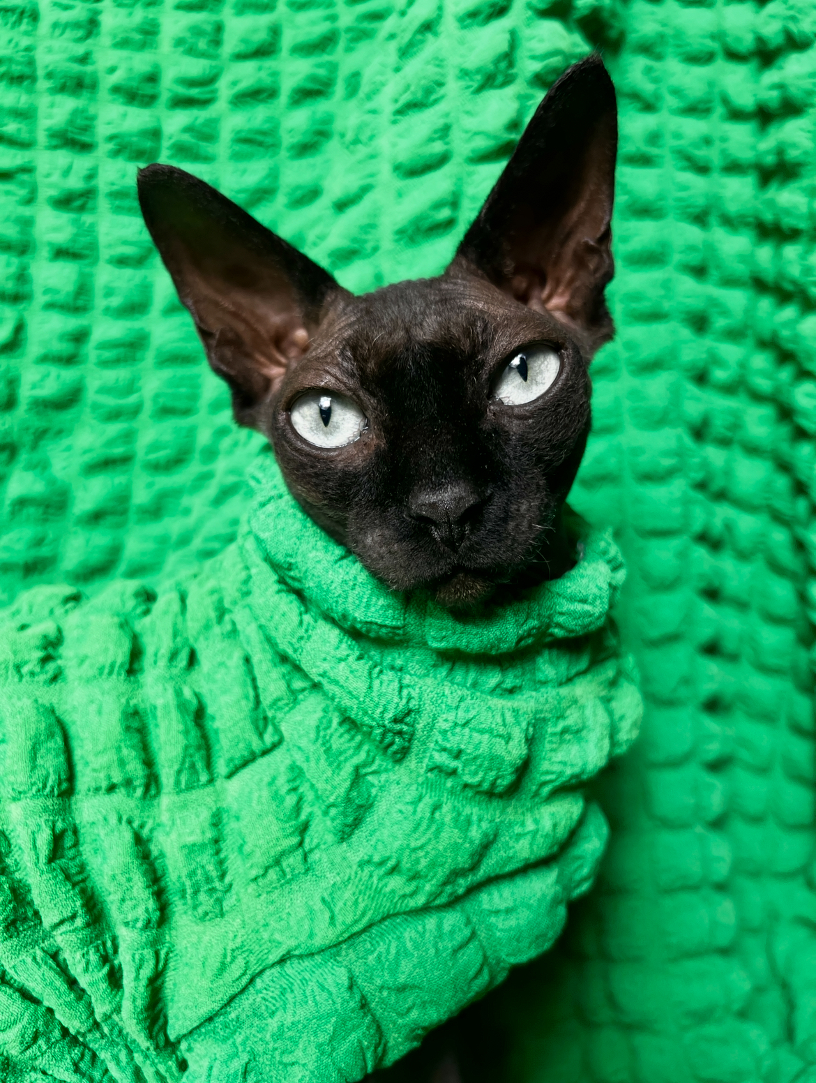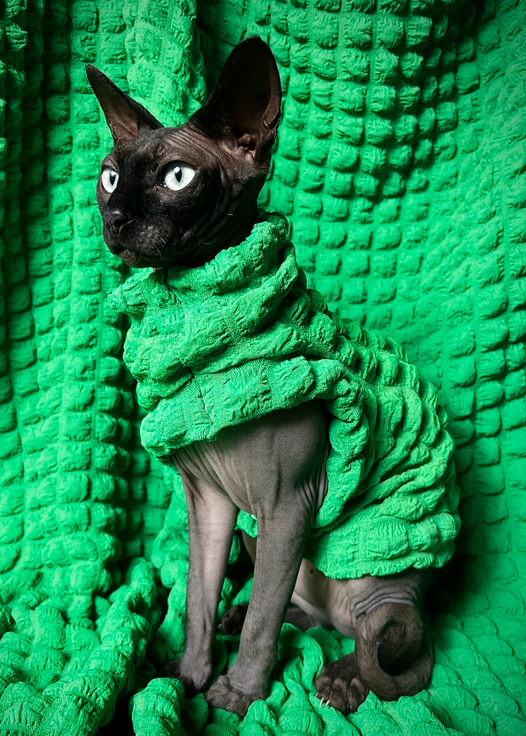 REGULAR size is for most adult hairless cats age 1 to 18. BAMBINO size fits hairless kittens age 6 months to 1 year and smaller adult cats. ANKLE BITER size fits hairless kittens 15 week to 6 month olds. LIL NIPPER size fits hairless kittens age 8 weeks to 15 week olds for when they are with the breeder or for the trip home. Custom orders are welcome for larger and smaller cats - pricing is the same - $27.50