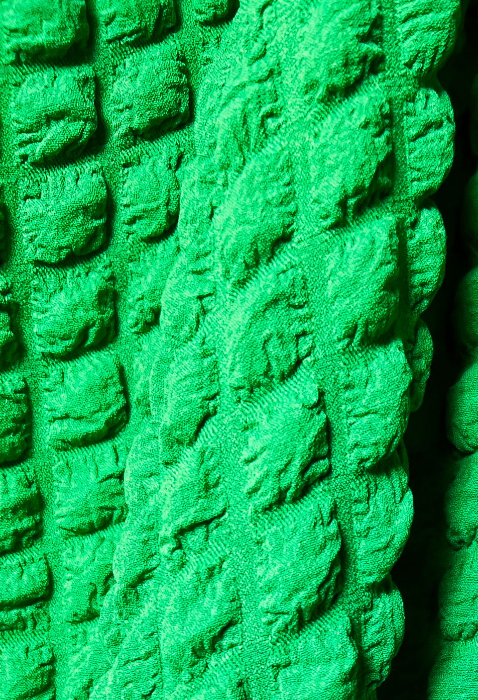 This is a stretchy lightweight green puckered fabric. Regular Size limited to only 7. Bambino Size limited to only 8. Ankle Biter Size limited to only 2. Lil Nipper size limited to only 2. No more will be made when they are gone.
