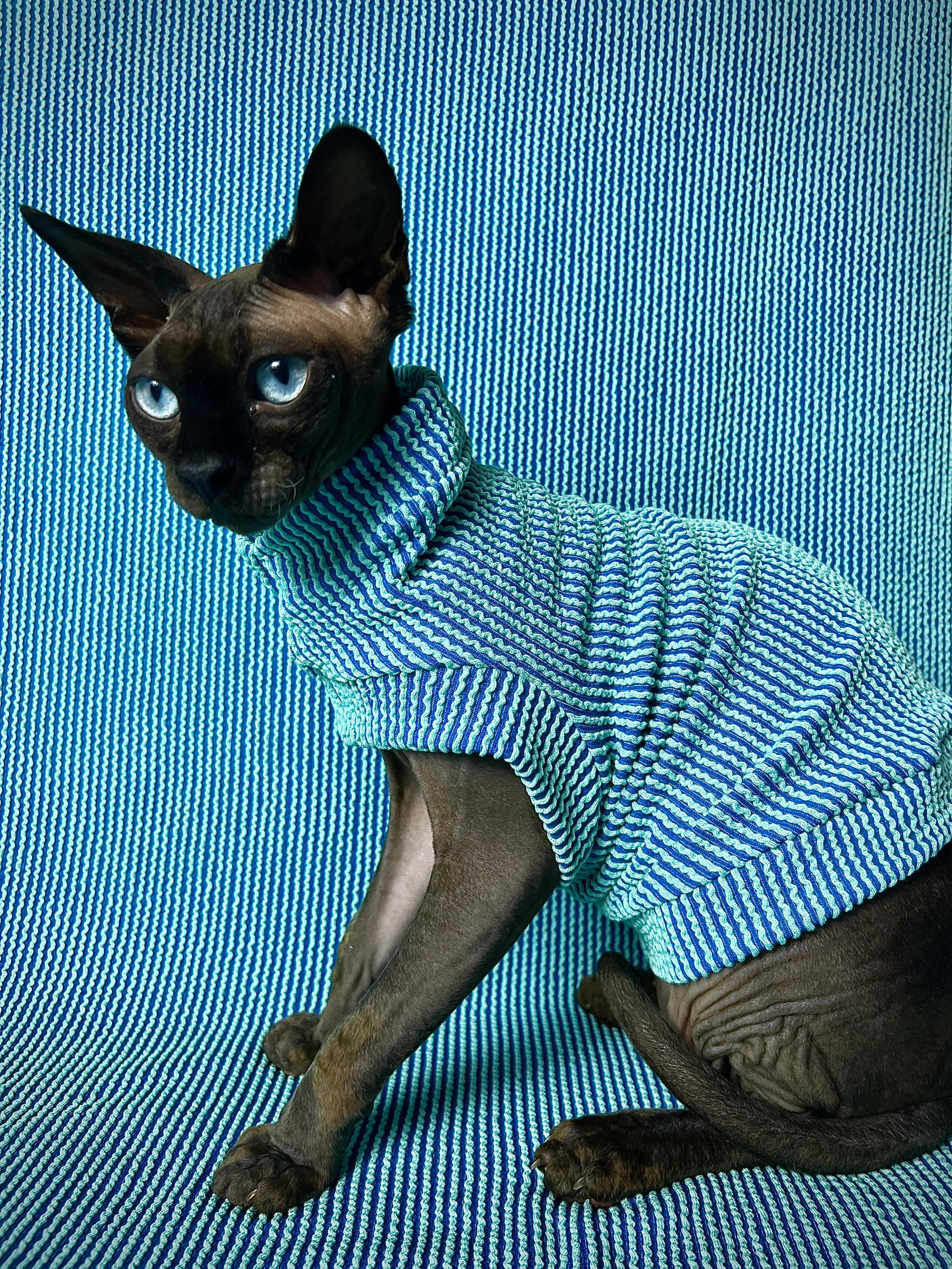 These sweaters fit like no other sweaters. Our original pattern has one hole for both front legs rather than individual holes. The unique design makes it easy to put on and take off, while allowing for improved mobility of your cat. No annoying Velcro anywhere. No awkward walking. All sweaters are machine washable and dryer safe unless specifically mentioned.