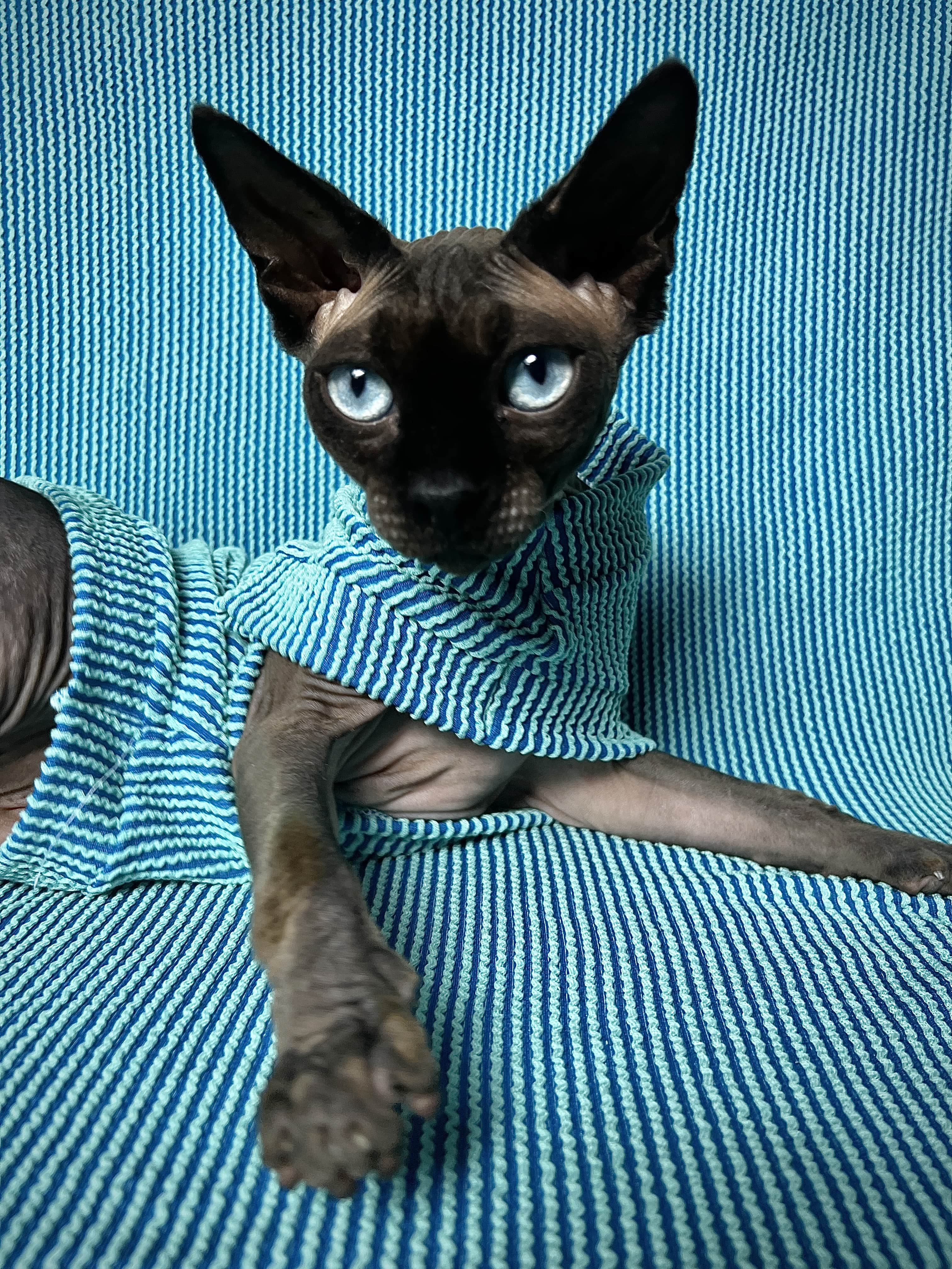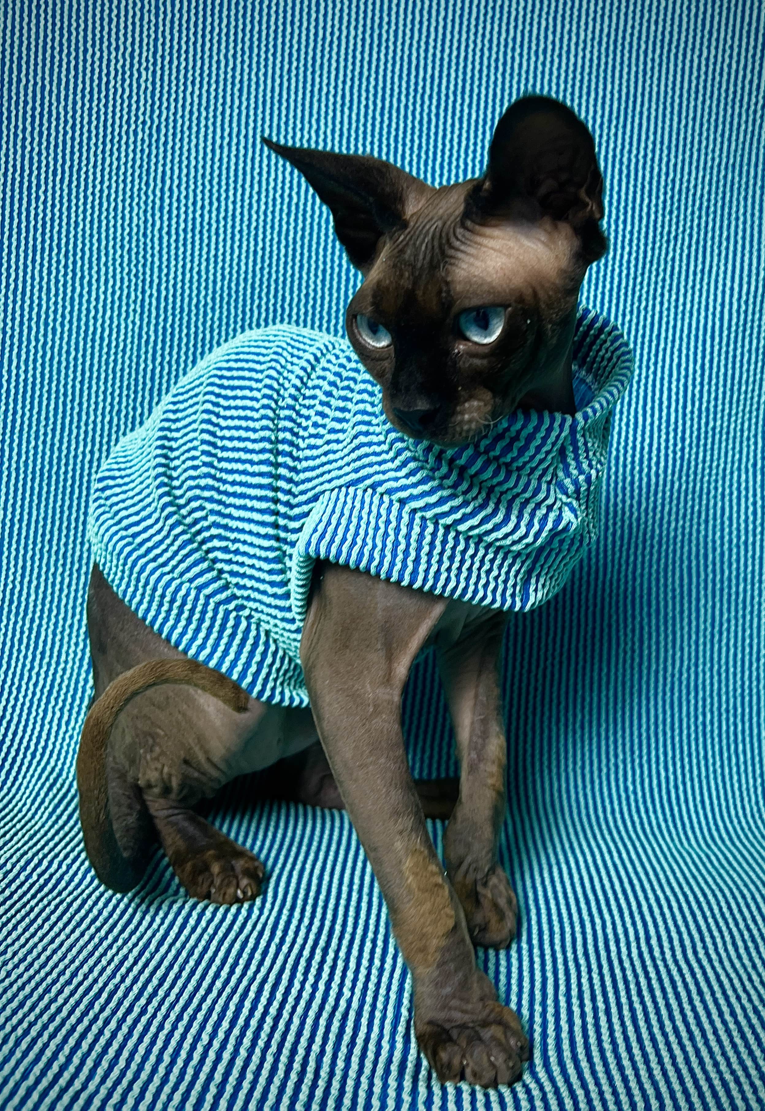 REGULAR size is for most adult hairless cats age 1 to 18. BAMBINO size fits hairless kittens age 6 months to 1 year and smaller adult cats. ANKLE BITER size fits kittens 15 weeks to 6 month olds. LIL NIPPER size fits hairless kittens age 8 weeks to 15 week olds for when they are with the breeder or for the trip home. Custom orders are welcome for larger and smaller cats - pricing is the same - $27.50