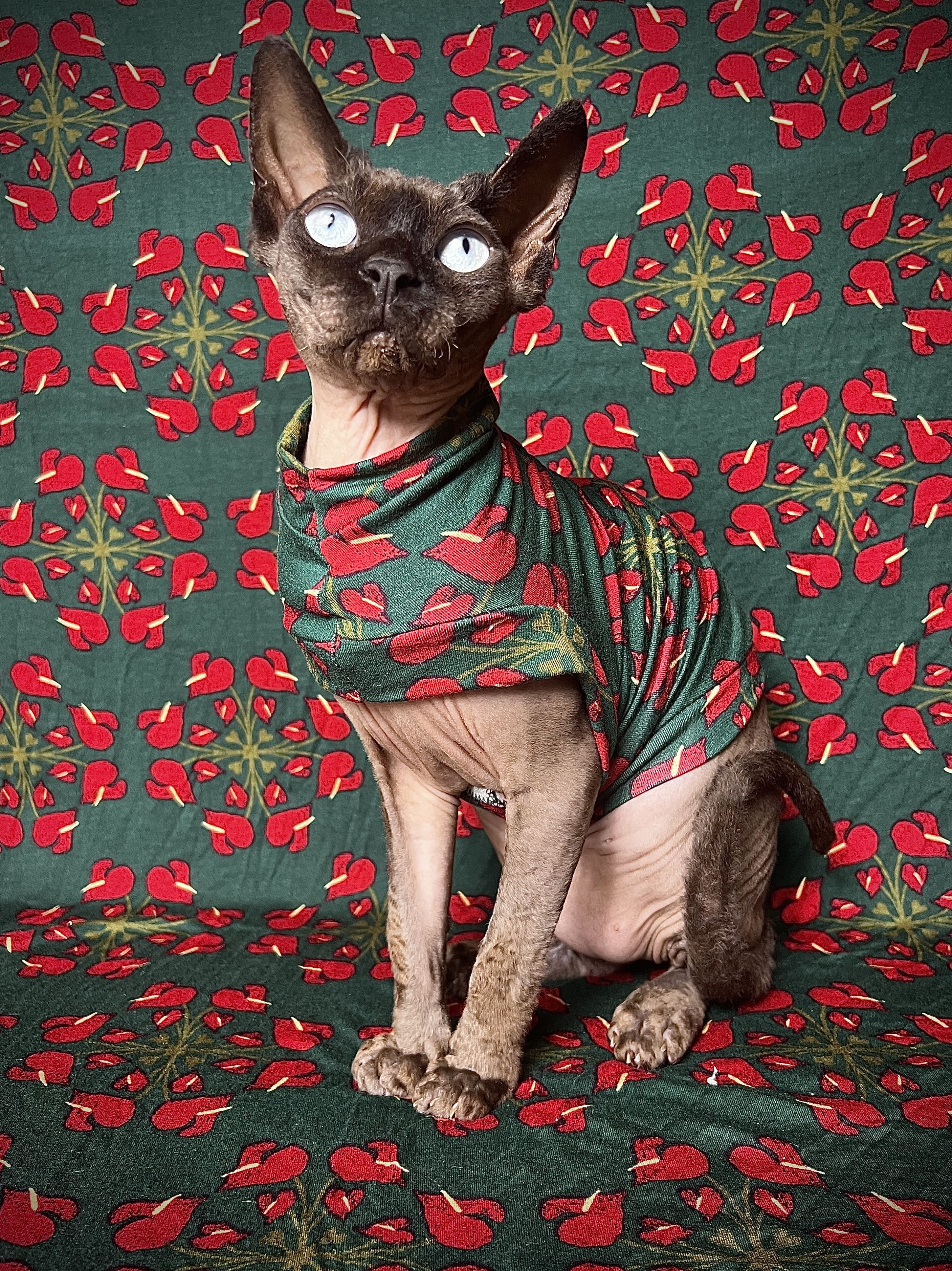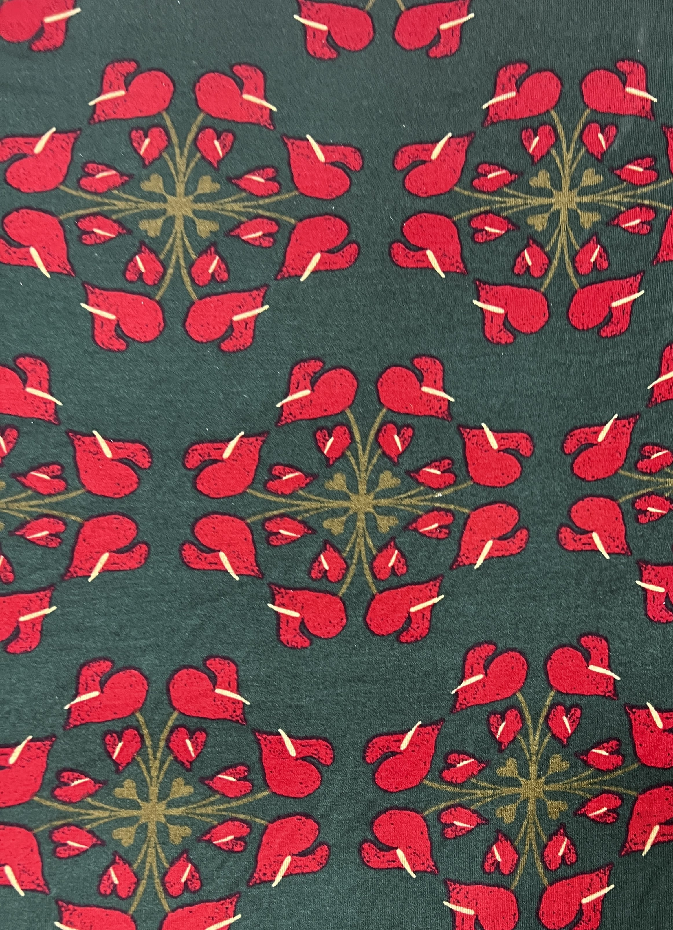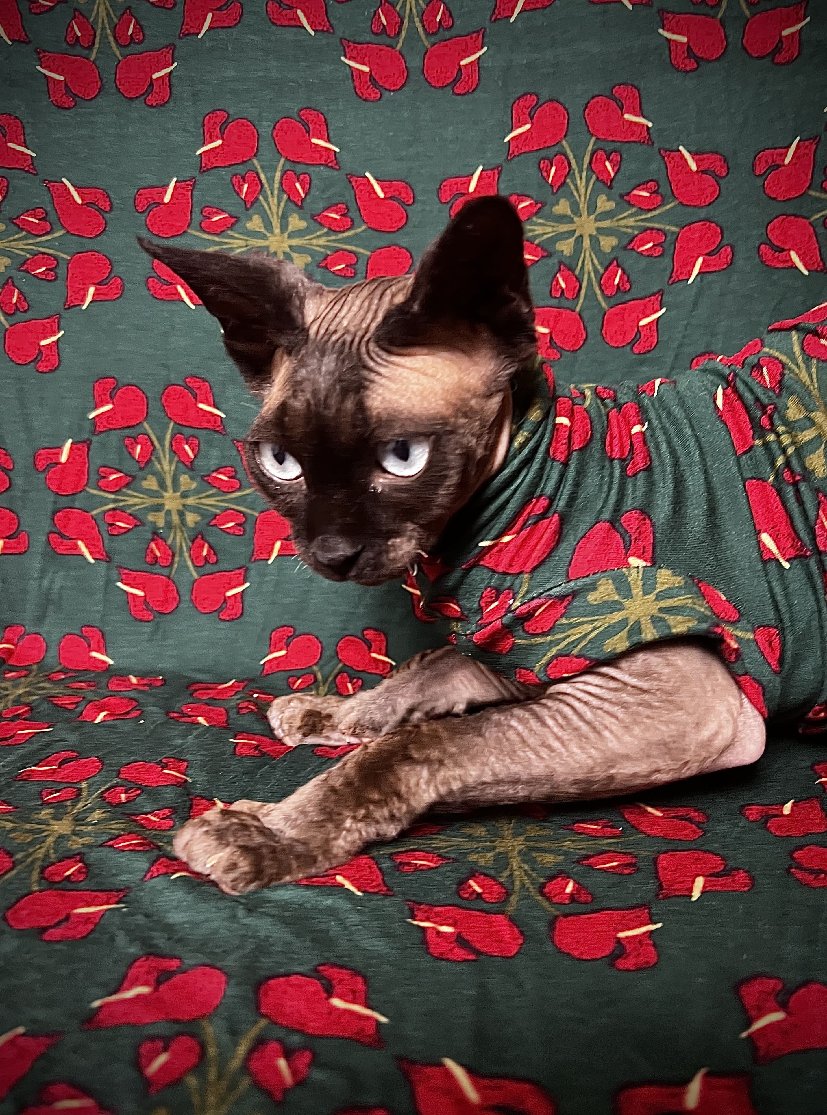 This sleepwear is a beautiful stretchy cotton blend fabric with anthurium wreaths on green background. Made with special seams that minimize the seem profile. Swag Sleepwear has a slimmer fit, larger armholes, and smaller trim to provide extra snuggly comfort for sleeping or catnapping! Regular Size limited to only 7. Bambino Size is limited to only 8, Ankle Biter Size is limited to 2, Lil Nipper Size is limited to 2. No more will be made when they are gone.