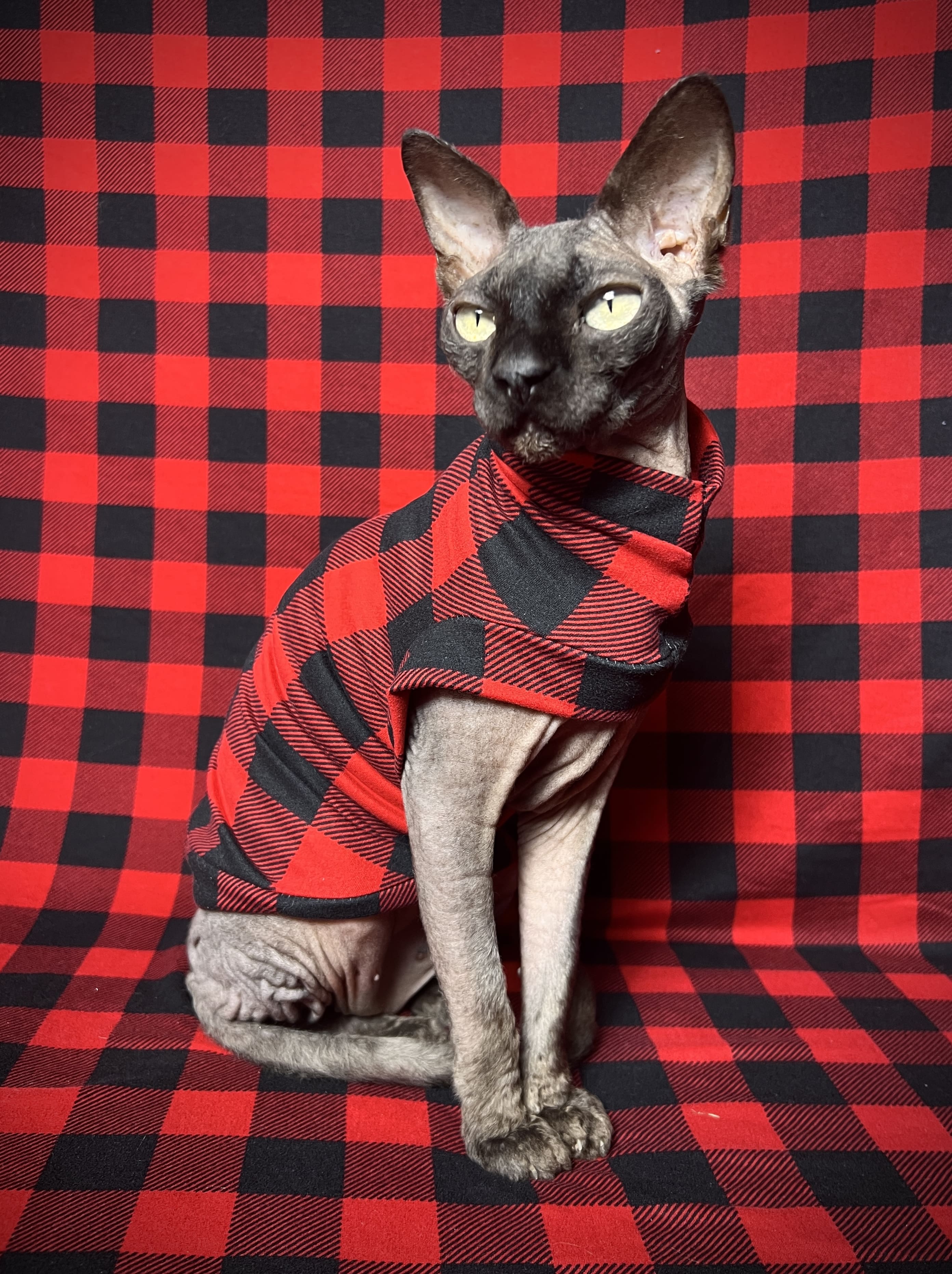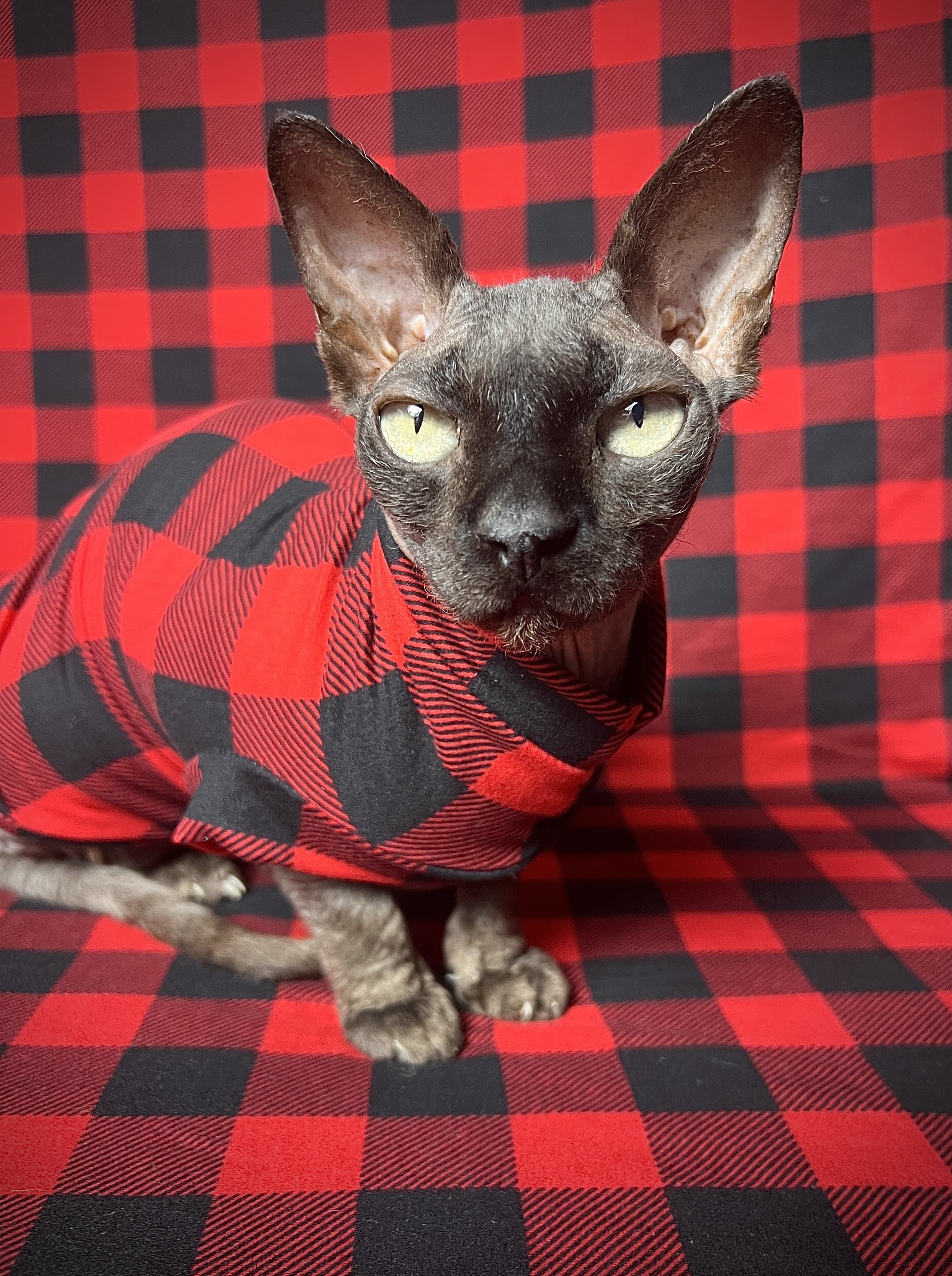 This sleepwear is a beautiful stretchy cotton blend fabric with red black buffalo plaid print. Made with special seams that minimize the seem profile. Swag Sleepwear has a slimmer fit, larger armholes, and smaller trim to provide extra snuggly comfort for sleeping or catnapping! Regular Size limited to only 7. Bambino Size is limited to only 8, Ankle Biter Size is limited to 2, Lil Nipper Size is limited to 2. No more will be made when they are gone.