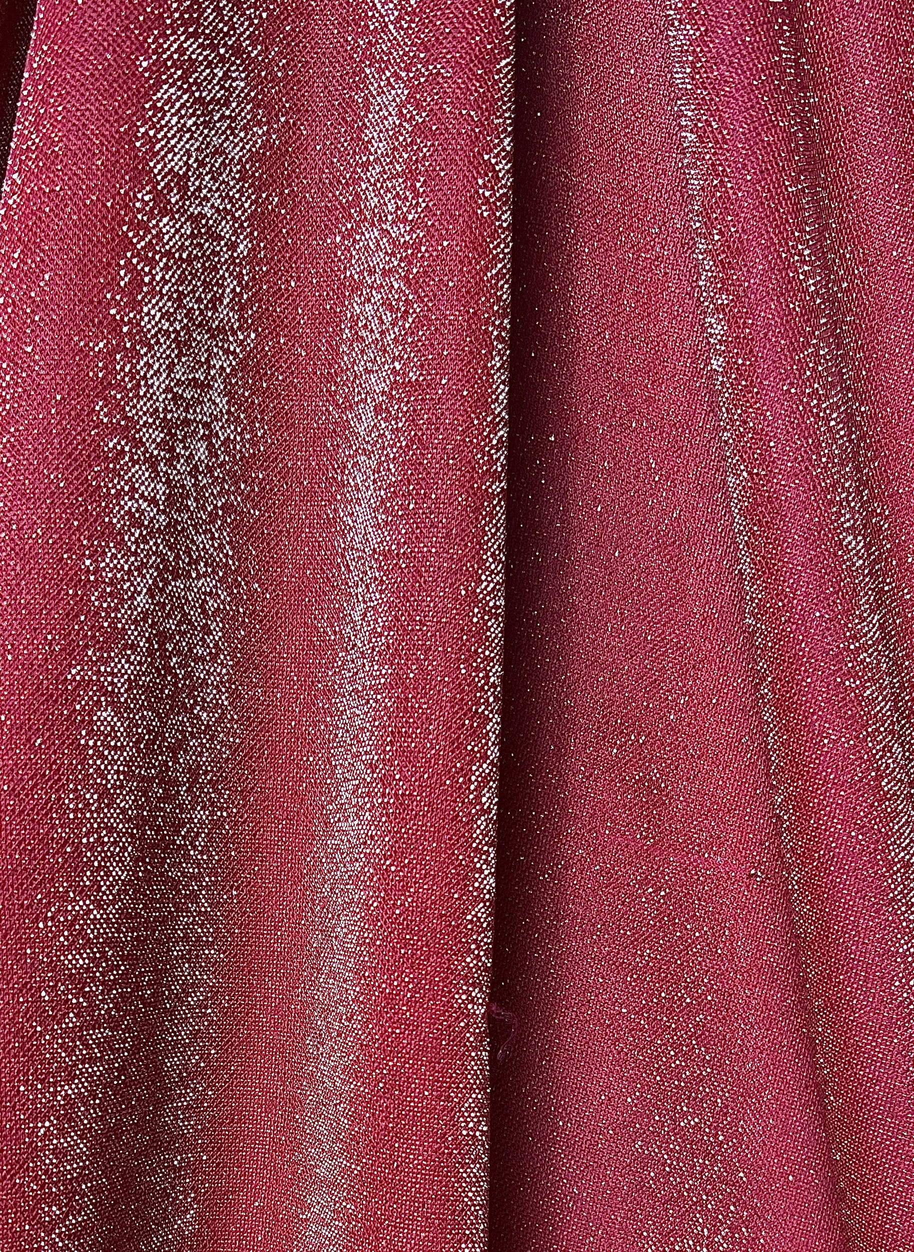 This is a lightweight stretchy red fabric with gold shimmer, featuring gold velvet trim.