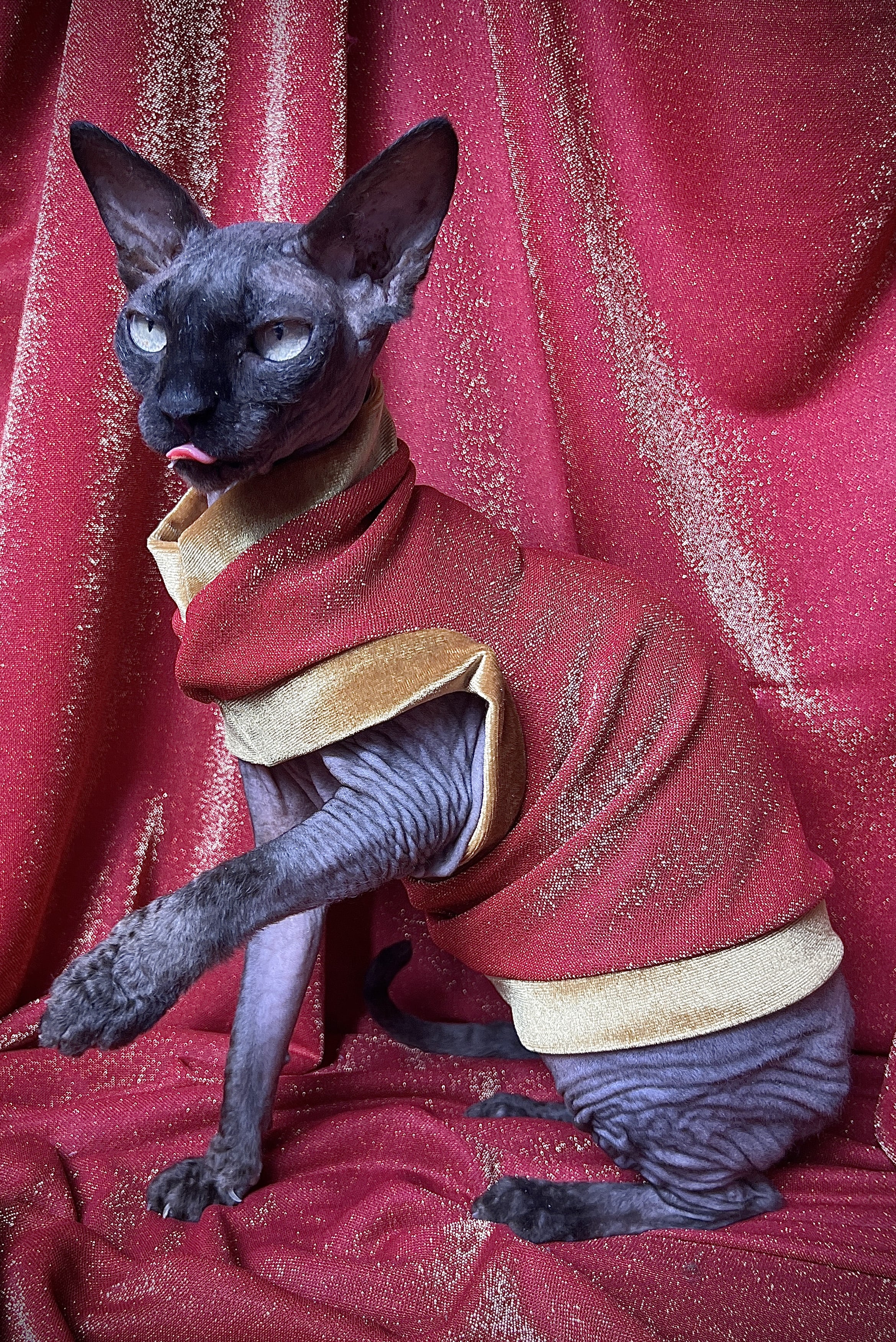 REGULAR size is for most adult hairless cats age 1 to 18. BAMBINO size fits hairless kittens age 6 months to 1 year and smaller adult cats. ANKLE BITER size fits kittens 15 weeks to 6 month olds. LIL NIPPER size fits hairless kittens age 8 weeks to 15 week olds for when they are with the breeder or for the trip home. Custom orders are welcome for larger and smaller cats - pricing is the same - $27.50